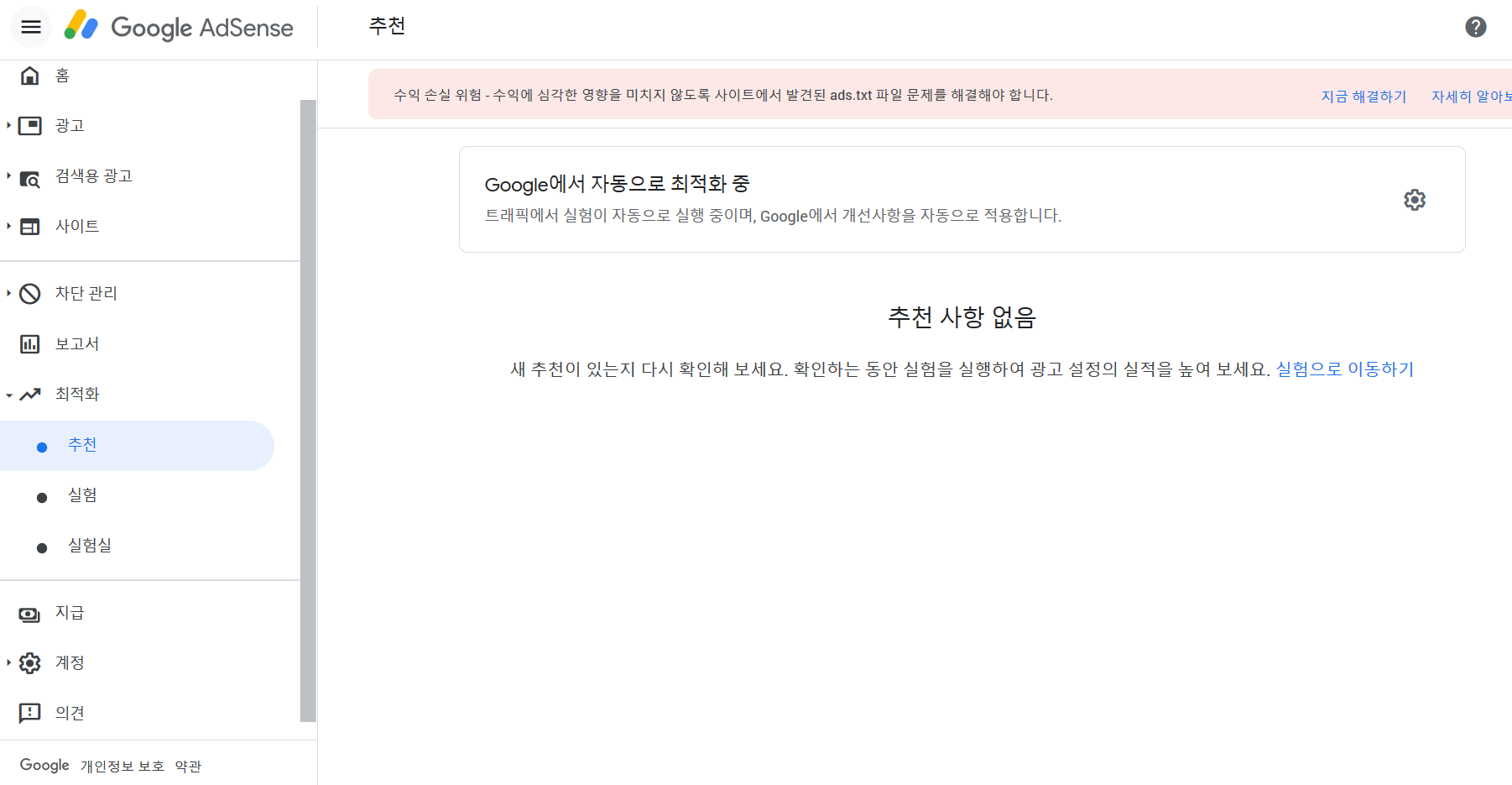 아래는 구글 애드센스 최적화 설정 화면입니다.